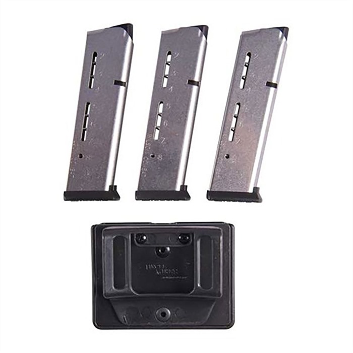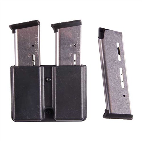 Wilson Combat applied 30 years of experience building high-performance 1911 magazines to develop this ultra-reliable magazine for combat, competition, or self-defense. Made with state-of-the-art materials using the latest manufacturing technology, these single-stack magazines are built tough to keep running in unforgiving, real-world conditions. The body formed from extra-thick stainless steel, with the radius of each curve engineered to minimize stress points, virtually eliminates feed lip cracking and stress fatigue. Even the position of the witness slots toward the rear is designed to enhance structural integrity. A proprietary welding, deburring, and polishing process provides an unusually strong, super-smooth seam to ensure snag-free follower movement and easy insertion in the mag well. The non-tilt follower of self-lubricating polymer fully supports the ammo stack to prevent nose-dives, double feeds, and other hang-ups. The mag body design puts less tension on the spring than standard magazines, increasing spring life and making it easy to seat a fully loaded magazine with the slide closed. The polymer base pad adds minimal bulk yet ensures a firm purchase even when your hands are wet; removes easily for cleaning. Numbers 1 through 10 stamped on the bottom help you mark each of your magazines to track usage and performance. .45 ACP fits Gov’t Model; 8 round capacity; round-count numbers stamped on body next to witness holes. Available in natural Silver or Black Oxide finish in singles or in convenient, money-saving 3-Paks with or without a Michael’s of Oregon double mag pouch of rugged, high-impact Kydex® molded polymer.