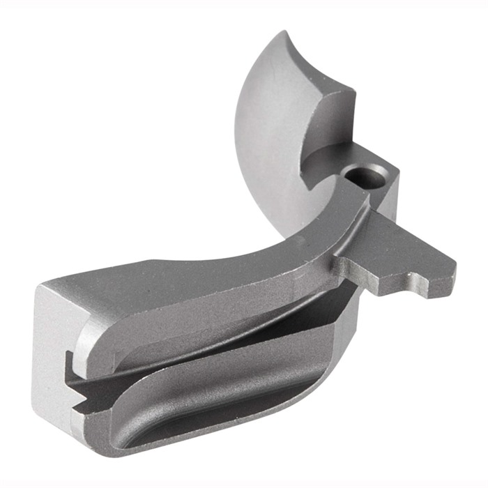 Beavertail grip safety machined from solid barstock is left slightly oversized at critical points to allow the gunsmith to achieve a true custom fit. Beavertail is wider than the frame so it can be fit to the frame instead of the frame to the beavertail, and helps you ensure a snug, rattle-free fit. Overall length is longer at the bottom and the angle is a match to fill the gap between the mainspring housing and the safety. Radius is .245" to fit frames that are pre-cut to .250". Pin hole is finish reamed to .158" to further improve fit and function. Large contact pad ensures positive engagement when the hand grasps the gun. .220 Radius grip safeties are made to fit Springfield and Caspian frames.