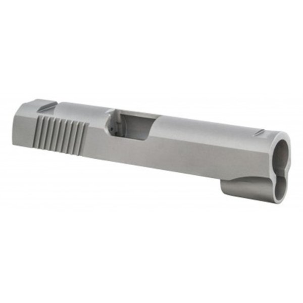 1911 Slide, Fusion Diamond Series, Commander, Combat, 1911 Colt style Slide, completely machined for 45acp or 9mm/38super caliber barrels. This Slide is precision CNC machined from 4140 Bar-Stock and heat treated. Features thick combat style rear serrations and standard dovetail Rear: .495 X 65 Degree Front: .330 X 65 Degree sight cuts. This Slide is precision CNC machined from 4140 Bar-Stock and heat treated. This slide is supplied "in the white", matte finish and oil dipped. The firing pin holes on all diamond series slides and top ends are reamed to take the 9mm / 38 super firing pin, as with all custom grade slides. This slide has the 45 ACP or 9mm/38 Super breech face cut so will work with all of the 45 cartridge groups, 45 acp, 45 Super, 400 Corbon, 460...etc.. or all the 9mm / 38 super cartridge group (9x19, 9x21, 9x23, 38 Super, etc)