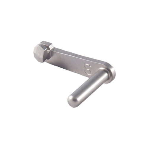 Heavy duty slide stop is precision machined from steel bar stock, then heat-treated for superb hardness and durability. Ensures a precise fit to frame for secure, consistent lockup; prevents slop or “play” that can compromise accuracy. Available with standard .200" diameter pin or oversized .203" pin for custom fitting to ensure the tightest possible lockup for maximum accuracy. Both sizes available in blued 4140 carbon steel or stainless steel, both with a fine bead-blasted matte finish. Fine-line serrations on pad give your finger secure purchase to release the slide on the first pass.