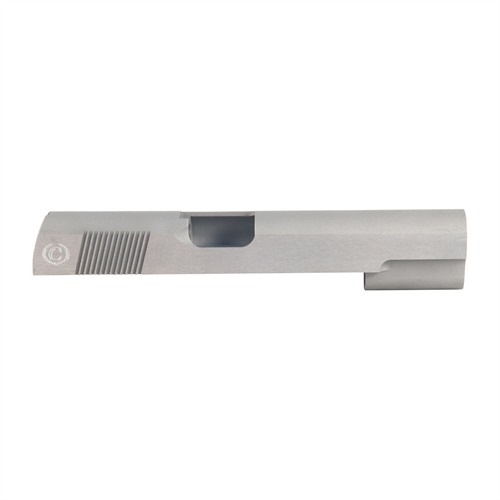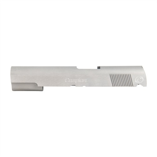 Custom-quality slides from Caspian, ready to be fitted to the frame of your choice. They start as high-quality forgings for extra strength, then are heat-treated to Rc 38-41 before machining for exceptional dimensional stability. Sides are polished, while the rest of the surface is bead-blasted for a non-glare, matte finish. Deep-cut, forward-angled rear cocking serrations prevent slippage when racking, even with a wet hand. Available in 4340 carbon steel (CS) and 416 stainless steel (SS) with .45 ACP, .40 S&W, and 9mm breechfaces. Commander and Officers models in .45 ACP only. Choose a slide without sight cuts (NC), or between two pre-cut dovetail options: a Novak Lo-Mount or Bo-Mar BMCS rear cut, both coupled with a Novak front cut. Recon slide is a Government slide with ball cuts at the front that line up with the light rail on the Caspian Recon frame (available separately). All slides require the use of a 9mm/.38 Super firing pin.