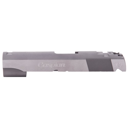 SPECS: 4340 carbon steel, in-the-white, or 416 stainless steel, natural finish. Government model accepts 5" barrel. Commander accepts 4.25" barrel. Officers model accepts 3.5" barrel. All Caspian slides require the use of a 9mm/.38 Super firing pin.