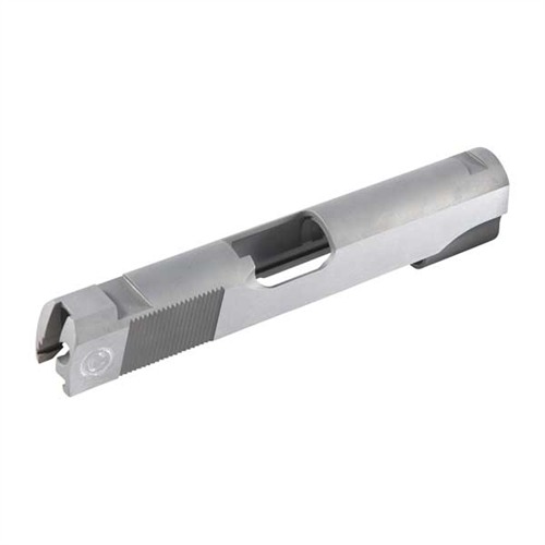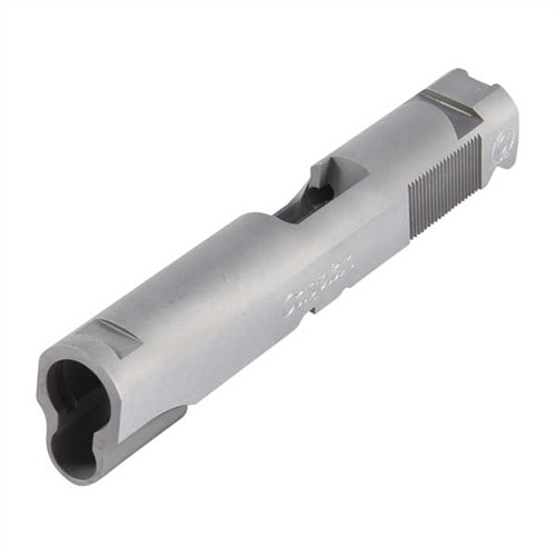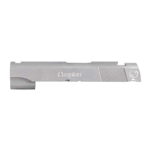 SPECS: 4340 carbon steel, in-the-white, or 416 stainless steel, natural finish. Government model accepts 5" barrel. Commander accepts 4.25" barrel. Officers model accepts 3.5" barrel. All Caspian slides require the use of a 9mm/.38 Super firing pin.