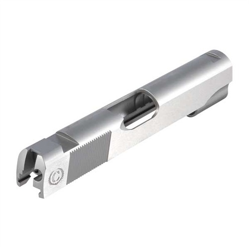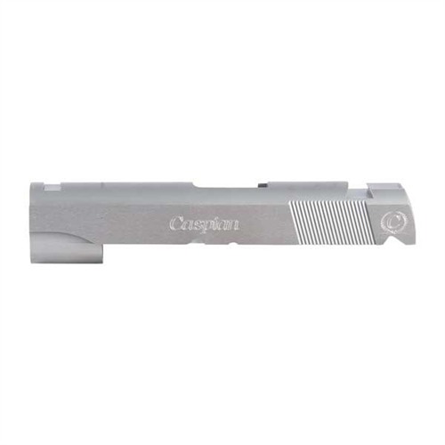 SPECS: 4340 carbon steel, in-the-white, or 416 stainless steel, natural finish. Government model accepts 5" barrel. Commander accepts 4.25" barrel. Officers model accepts 3.5" barrel. All Caspian slides require the use of a 9mm/.38 Super firing pin.
