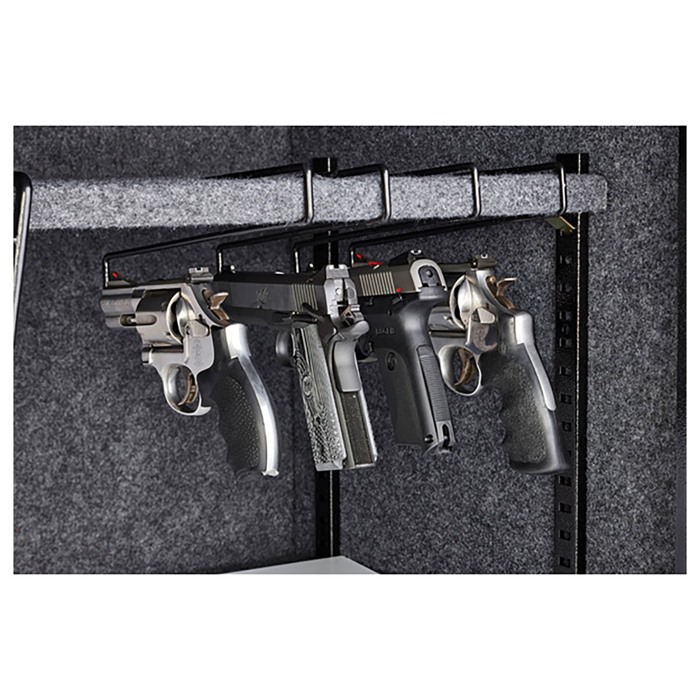 Maximize space by hanging handguns from shelves in your safe. Made with a PVC coating, handgun hangers are convenient, durable and prevent marring or scratching inside the gun’s barrel. Handgun hangers fit shelves that are ½ to 1” thick. Maximizes safe space by hanging guns below shelves. PVC coating prevents damage to gun barrels. Space should always be at a premium in your gun safe. Maximize the number of guns in your safe with these easy hangers.