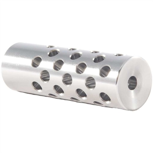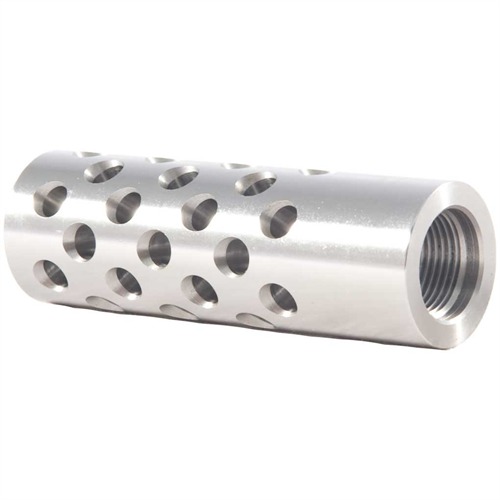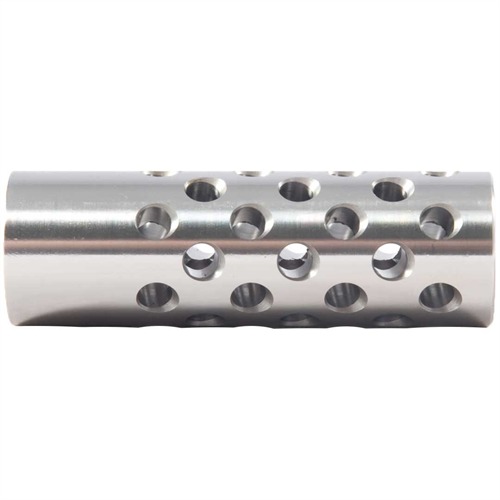 Multi-port brake softens felt recoil and reduces muzzle rise. A single expansion chamber and 42 total ports, 21 on each side, angled 7° forward, provide maximum recoil control. Gunsmithing required. Comes with a .220" (nominal) diameter exit hole that must be opened up to .020" larger than bullet diameter. Can be enlarged to allow bullets up to .44 caliber. Rear exterior of comp can be machined to conform to barrel.