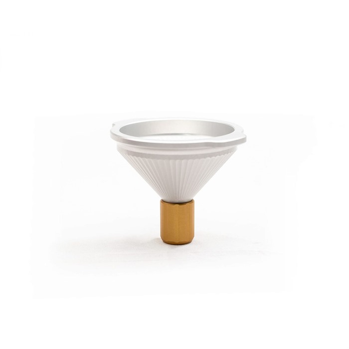 Grensesnittet mellom hodene og traktet er designet slik at ingen korn kan sette seg fast mellom de to, så lenge hodet er skrudd til. Den 3/8″ høye rette seksjonen på toppen bidrar til å forhindre at pulverkorn hopper ut når de helles i. Glatte overflater ved nakken av traktet og innsiden av hodene fremmer rask flyt og forhindrer at korn setter seg fast.