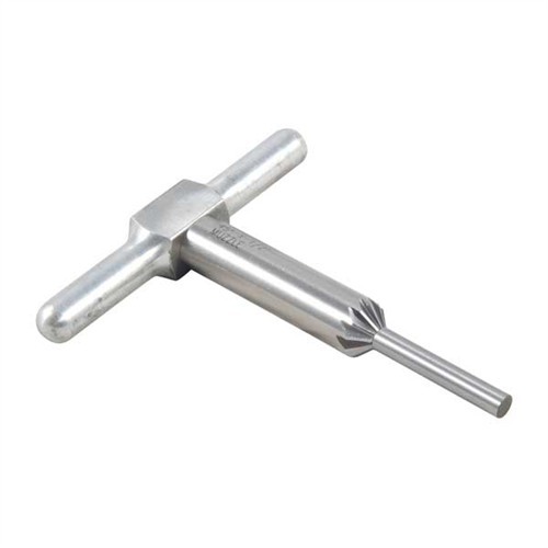 45° chamfering cutter bryter kantene på riflingen for en ren kuleutgang eller chamferer revolverens kammer for raskere omlasting. Settet inkluderer kutteren, et håndtak og en pilot, alt pakket i en polypropylenboks. Den utskiftbare piloten holder kutteren riktig justert. Kjøp ekstra piloter for å bruke én cutter til mange forskjellige kalibre. Piloter for andre kalibre er tilgjengelige separat. 45° kutteren som leveres i sett merket med * har en diameter på 5/8" for å korrekt chamfre større løp og kammer på de kalibrene. Alle andre sett har en diameter på ½" med 45° cutter.