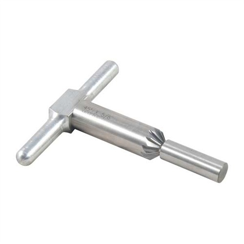 45° chamfering cutter bryter kantene på riflingen for en ren kuleutgang, og chamferer revolverens sylinderkammer for raskere omlasting. Dette settet inkluderer kutteren, et håndtak og en pilot, alt pakket i en polypropylenboks. Den utskiftbare piloten holder kutteren riktig justert. Kjøp ekstra piloter for å bruke én cutter til mange forskjellige kalibre. Piloter for andre kalibre er tilgjengelige separat. 45° Cutter som leveres i sett merket med * har en diameter på 5/8" for å korrekt chamfre de større løpet og sylinderåpningene på disse kalibrene. Alle andre sett har en diameter på ½".