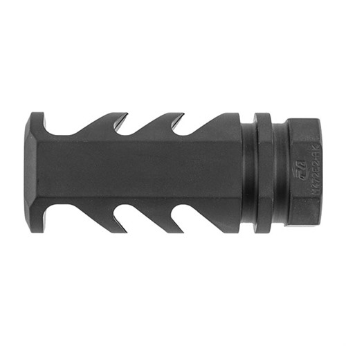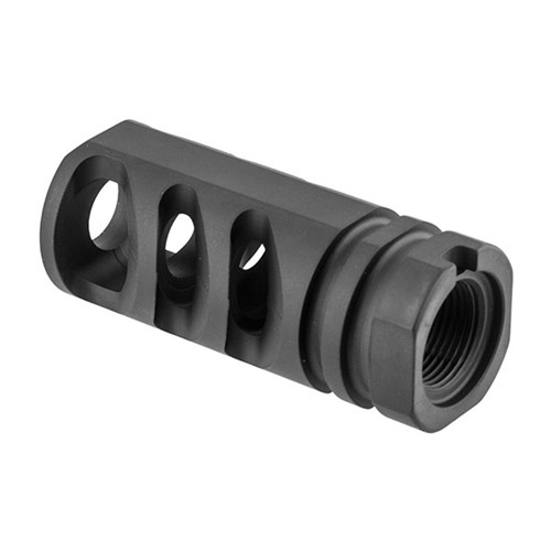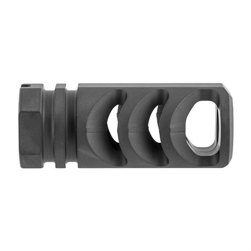 SPECS: HTSR 416 stainless steel bar stock, matte black or in-the-white stainless steel finish. 14x1mm LH threads. 2.25" (5.2cm) OAL. 0.875" (2.2cm) dia. 2.6 oz (73.7g) wt. Designed to fit AK style rifles chambered in 7.62x39mm.