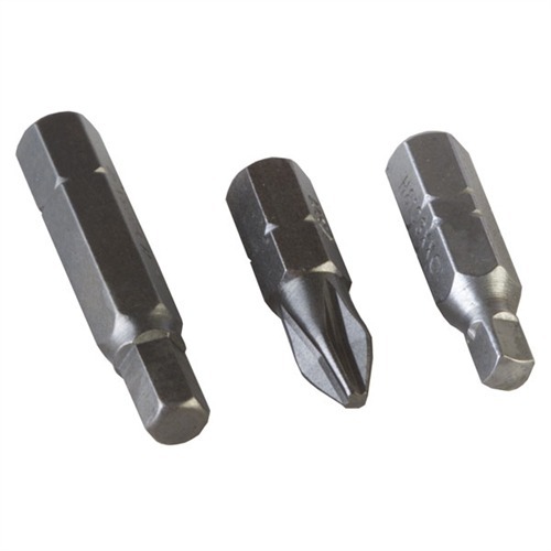 All are our standard 1" (2.5cm) long, ¼" (6.3mm) hex shank bits. Phillips bits are NOT anti-cam. Square socket screws are in RV s, cabinets, other places. 1⁄8" square fits newer Remington butt plates.