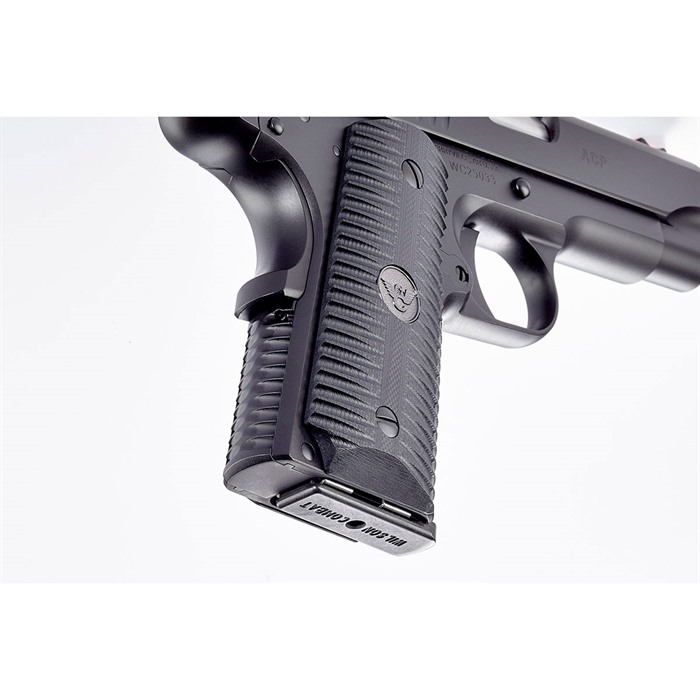 The ACP is built with Wilson Combat's highest quality parts in the same time-tested way as their other custom 1911 handguns, but with reduced customer selected options that streamlines their production and enables a lower price to the end user. Available in 9mm Luger, the ACP features their latest generation forged slide, frame and barrels that are hand fitted by their skilled pistolsmiths with their 100% machined Bullet Proof parts for a lifetime of high performance. The ACP retains the best-in-class Wilson Combat 100% Customer Satisfaction Guarantee for the lifetime of the product. The ACP also introduces the new Eagle Claw grip and slide surface to set it apart from the rest of the pack.The Eagle Claw pattern offers a non-abrasive, tactile grip under adverse conditions but is still easy on your hands and clothing during extended range trips and every day carry. The unique look and feel of the Eagle Claw is like nothing else we have produced. Available in Full-Size 5", 4.25” Commander or 4” Compact sizes in Armor Tuff® finished carbon steel. The ACP brings Wilson Combat quality to more American shooters than ever before.