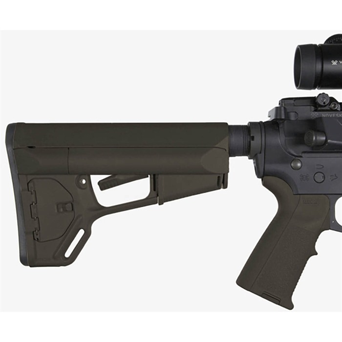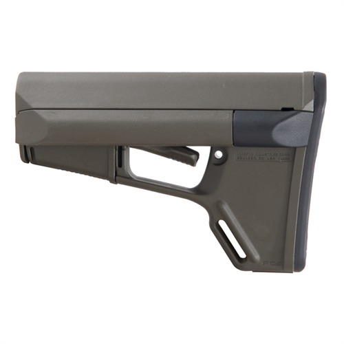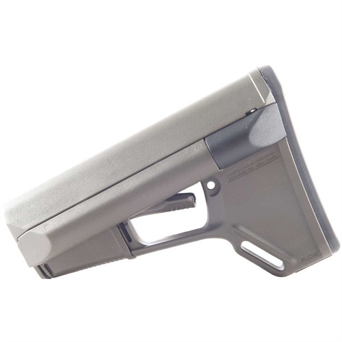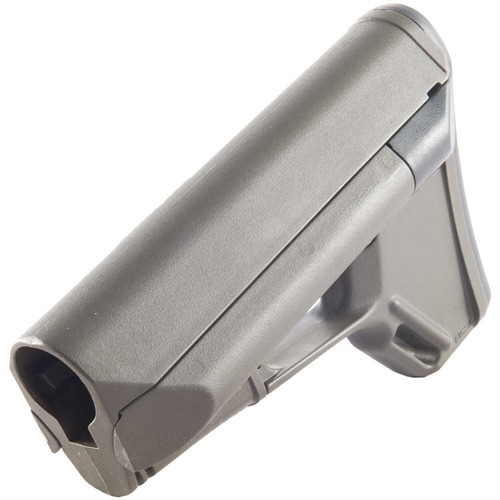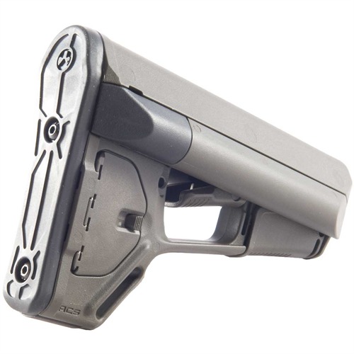 Adaptable Carbine/Storage (ACS) stock is a drop-in replacement for standard USGI M4 collapsible stock that gives the tactical operator extra storage options, a secure, comfortable cheekweld, and an advanced dual-locking lever. Smooth, streamlined exterior contours prevent snagging on clothing, sling, or vegetation, and help ensure fast exits from vehicles without snagging on gear. Removable battery storage compartments run the full length of the extra-wide comb and hold 2 AA or 3 CR-123 batteries, while providing a wide, contoured area for an exceptionally solid, comfortable cheekweld. Secure molded rubber caps keep water and dust out of compartments and face the rear of the stock for easy removal; cap exterior is beveled to resist snagging when shouldering weapon. Positive-locking trapdoor on right side of the stock reveals a roomy storage compartment for additional batteries, coiled up cleaning cable and other cleaning supplies, ear plugs, spare parts, or other small items. Magpul’s dual locking system uses an additional cam lever to protect the release lever from accidental operation, yet still allows you to adjust length of pull by simply pushing on the release lever. Slot molded in the toe provides an attachment point for a 1¼" wide sling. Also includes the same detachable rubber buttpad found on Magpul CTR and UBR buttstocks to help keep stock firmly mounted on shoulder. Mil-Spec fits 1.14" O.D. buffer tubes on Colt-manufactured M4 and similar mil-spec tubes that accept both four- and six-position collapsible stocks.