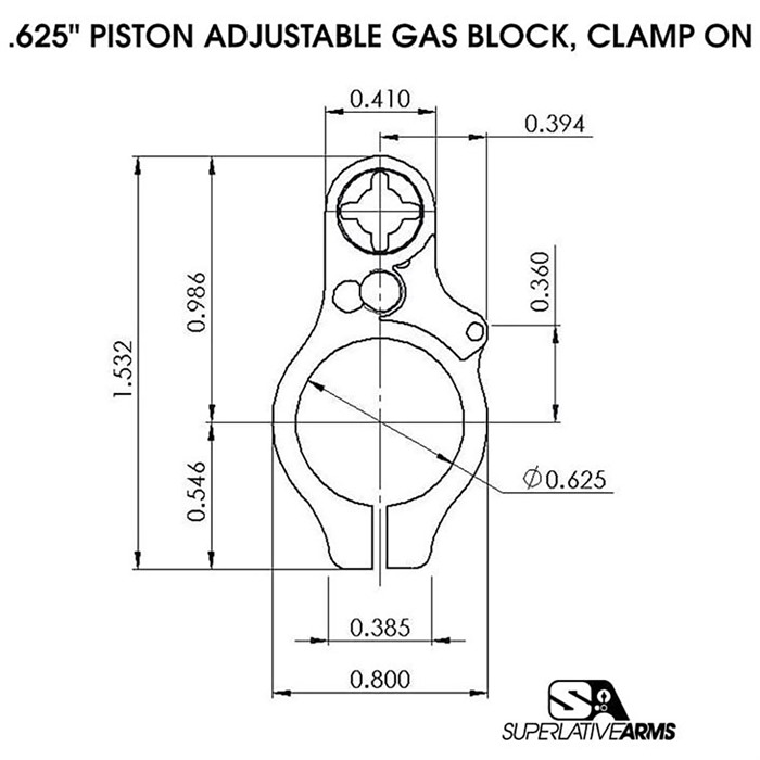 SUPERLATVIE ARMS LLC AR-15 ADJUSTABLE PISTON SYSTEM W/CLAMP 0.625" BLOCK RIGHT HAND The Superlative Arms Patented Bleed Off® Mode, gas piston system for the AR-15 platform adjusts the gas flow by bleeding the gas out the front of the block instead of restricting the flow like conventional adjustable blocks. RESULTS: The pressure used in the block is reduced only to the amount required to drive the bolt carrier. The remaining gas and pressure are bled out of the block allowing the system to run much cleaner and cooler. Reduction of wear on the bolt carrier group components and upper receiver. Reduction of felt recoil allowing for faster follow-up shots. Patented adjustment detent is located outside of the block and therefore no contamination. In Bleed Off Mode the gas adjustment screw does not restrict the gas flow; therefore, there is no erosion or seizing of the screw, and no loss of detent due to carbon build up. Although it is removable, we have added a safety mechanism, which stops you from unintentionally backing the screw all the way out. When using SBR’s and/or suppressors the Bleed Off port allows the excessive pressure to be exhausted out of the block reducing blow back. NOTE: The Superlative Arms Piston Kit does not come with a Bolt Assembly (bolt, cam pin, firing pin, or firing pin retainer). Bolt Assembly sold separately. ***NOTICE: PRIOR TO PURCHASING THIS PRODUCT*** Please review the barrel schematic for the critical dimensions necessary to safely operate the pistol length piston system. There is no industry standard for the distance between the barrel extension to the center of the gas hole. This is critical for the op rod length. If it is not the same distance as stated on the schematic, you may bend the op rod. THIS PRODUCT IS NOT RATED FOR 300 BLK!!! SPECIFICATIONS: Piston Systems: Piston Kits Gas Block Size: .625 Gas Block Style: Clamp On Gas System Length: Pistol Carrier Type: Full-Auto, AR-15 Carrier Finish: Dark DLC