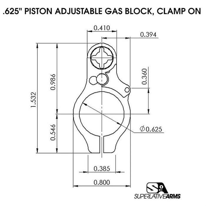 SUPERLATVIE ARMS LLC AR-15 ADJUSTABLE PISTON SYSTEM W/CLAMP 0.625" BLOCK LEFT HAND The Superlative Arms Patented Bleed Off® Mode, gas piston system for the AR-15 platform adjusts the gas flow by bleeding the gas out the front of the block instead of restricting the flow like conventional adjustable blocks. RESULTS: The pressure used in the block is reduced only to the amount required to drive the bolt carrier. The remaining gas and pressure are bled out of the block allowing the system to run much cleaner and cooler. Reduction of wear on the bolt carrier group components and upper receiver. Reduction of felt recoil allowing for faster follow-up shots. Patented adjustment detent is located outside of the block and therefore no contamination. In Bleed Off Mode the gas adjustment screw does not restrict the gas flow; therefore, there is no erosion or seizing of the screw, and no loss of detent due to carbon build up. Although it is removable, we have added a safety mechanism, which stops you from unintentionally backing the screw all the way out. When using SBR’s and/or suppressors the Bleed Off port allows the excessive pressure to be exhausted out of the block reducing blow back. NOTE: The Superlative Arms Piston Kit does not come with a Bolt Assembly (bolt, cam pin, firing pin, or firing pin retainer). Bolt Assembly sold separately. ***NOTICE: PRIOR TO PURCHASING THIS PRODUCT*** Please review the barrel schematic for the critical dimensions necessary to safely operate the pistol length piston system. There is no industry standard for the distance between the barrel extension to the center of the gas hole. This is critical for the op rod length. If it is not the same distance as stated on the schematic, you may bend the op rod. THIS PRODUCT IS NOT RATED FOR 300 BLK!!! SPECIFICATIONS: Piston Systems: Piston Kits Gas Block Size: .625 Gas Block Style: Clamp On Gas System Length: Pistol Carrier Type: Full-Auto, AR-15 Carrier Finish: Dark DLC