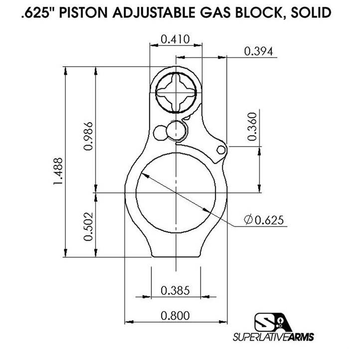 SUPERLATIVE ARMS LLC AR-15 ADJUSTABLE PISTON SYSTEM W/0.625" GAS BLOCK RIGHT HAND The Superlative Arms Patented Bleed Off® Mode, gas piston system for the AR-15 platform adjusts the gas flow by bleeding the gas out the front of the block instead of restricting the flow like conventional adjustable blocks. RESULTS: The pressure used in the block is reduced only to the amount required to drive the bolt carrier. The remaining gas and pressure are bled out of the block allowing the system to run much cleaner and cooler. Reduction of wear on the bolt carrier group components and upper receiver. Reduction of felt recoil allowing for faster follow-up shots. Patented adjustment detent is located outside of the block and therefore no contamination. In Bleed Off Mode the gas adjustment screw does not restrict the gas flow; therefore, there is no erosion or seizing of the screw, and no loss of detent due to carbon build up. Although it is removable, we have added a safety mechanism, which stops you from unintentionally backing the screw all the way out. When using SBR’s and/or suppressors the Bleed Off port allows the excessive pressure to be exhausted out of the block reducing blow back. NOTE: The Superlative Arms Piston Kit does not come with a Bolt Assembly (bolt, cam pin, firing pin, or firing pin retainer). Bolt Assembly sold separately. SPECIFICATIONS: Piston Systems: Piston Kits Gas Block Size: .625 Gas Block Style: Solid, Set Screw Gas System Length: Carbine Carrier Type: Full-Auto, AR-15 Carrier Finish: Dark DLC