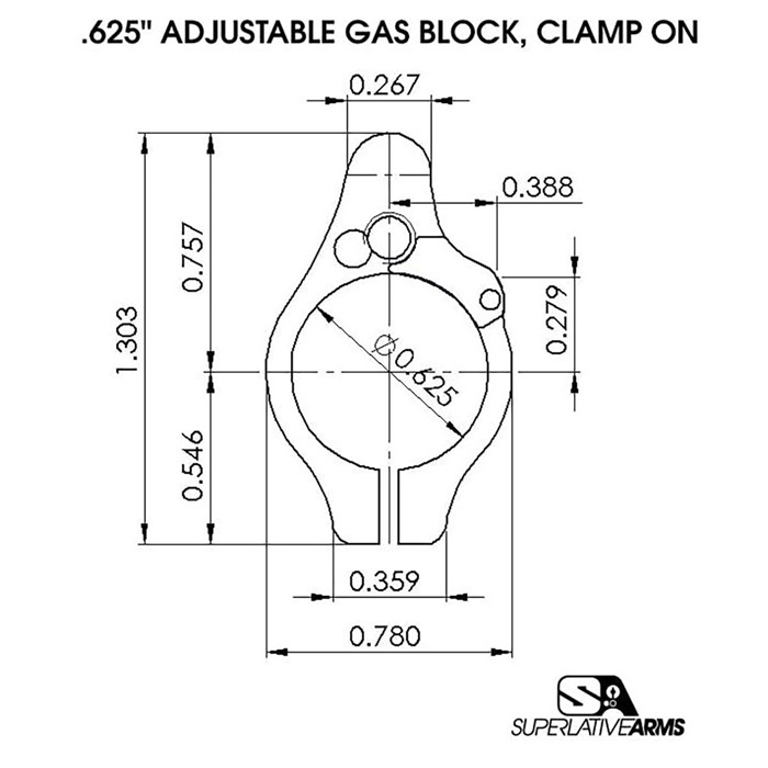 The Superlative Arms patented “Bleed Off”, direct impingement, gas block for the AR15 platform adjusts the gas flow by bleeding the gas out of the block instead of restricting the flow like conventional adjustable blocks. Results: The pressure used in the block is reduced only to the amount required to drive the bolt carrier. The remaining gas / pressure are bled out of the block allowing the system to run much cleaner and cooler. Reduction of felt recoil. Patented adjustment detent is located outside of the block and therefore no contamination. The gas adjustment screw does not restrict the gas flow; therefore there is no erosion or seizing of the screw / no loss of detent due to carbon build up. Although it is removable, we have added a safety mechanism, which stops you from unintentionally backing the screw all the way out. When using SBR’s and / or suppressors the bleed off port allows the excessive pressure to be exhausted out of the block reducing blow back. Data: Gas Block Material: 416 SS Barrel Diameter: 0.625" Weight: 1.34 oz. Length: 1.00" Attachment Type: Clamp on Adjustment: Front of Block Included: Gas Block - Assembled (2) 10-32 x 3/16" Socket Head Cap Screws (1) Gas Tube Roll Pins (1) 3/32 X 6" L-Shaped Hex Keys Installation Instructions & QR code for video tutorial