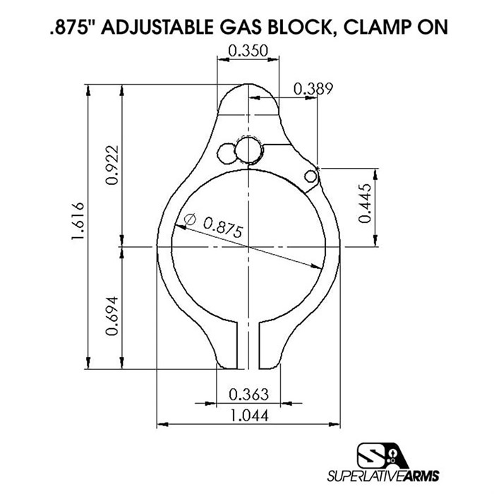 The Superlative Arms patented “Bleed Off”, direct impingement, gas block for the AR15 platform adjusts the gas flow by bleeding the gas out of the block instead of restricting the flow like conventional adjustable blocks. Results: The pressure used in the block is reduced only to the amount required to drive the bolt carrier. The remaining gas / pressure are bled out of the block allowing the system to run much cleaner and cooler. Reduction of felt recoil. Patented adjustment detent is located outside of the block and therefore no contamination. The gas adjustment screw does not restrict the gas flow; therefore there is no erosion or seizing of the screw / no loss of detent due to carbon build up. Although it is removable, we have added a safety mechanism, which stops you from unintentionally backing the screw all the way out. When using SBR’s and / or suppressors the bleed off port allows the excessive pressure to be exhausted out of the block reducing blow back. Data: Gas Block Material: 416 SS Barrel Diameter: 0.625" Weight: 1.34 oz. Length: 1.00" Attachment Type: Clamp on Adjustment: Front of Block Included: Gas Block - Assembled (2) 10-32 x 3/16" Socket Head Cap Screws (1) Gas Tube Roll Pins (1) 3/32 X 6" L-Shaped Hex Keys Installation Instructions & QR code for video tutorial