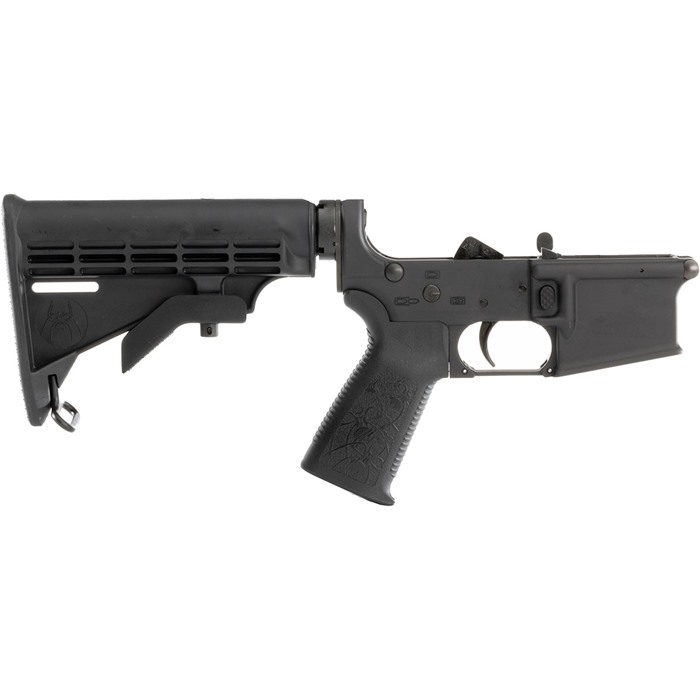Semi-auto lower receiver is machined from a 7075 T6 aluminum forging to mil-spec dimensions for precise fit and outstanding performance. Ruggedized hardcoat anodized finish resists scuffs, scratches, and wear. Stamped and color-coded bullet selector position markings notify operator when weapon is in “safe” or “semi-auto.” A “full-auto” position is not selectable but gives this semi-auto lower receiver the appearance of being multi-burst capable. Magazine well features Spike’s spider logo and multi-cal engraving. Complete Lower w/Buttstock includes stainless steel trigger, black oxide finished trigger guard and hammer assembly, pistol grip, six-position mil-spec buffer tube (1.146" O.D.), ST-T2 tungsten heavy buffer, mil-spec 17-4 stainless steel buffer spring, and Spike’s M4 stock.