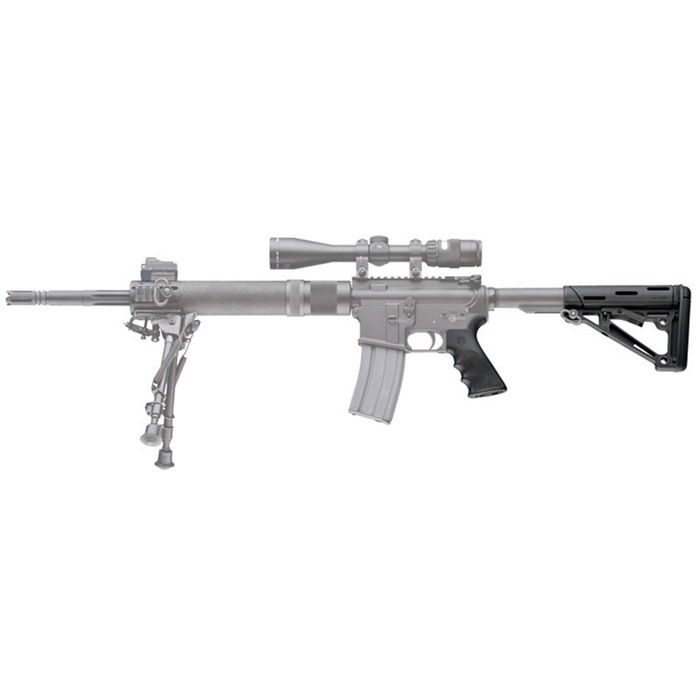 Hogue’s 2 Piece Kit contains a finger grooved beavertail rubber grip and a collapsible buttstock. The beavertail grip is specifically designed to retain the important lines and aesthetics of tactical rifles. It provides a comfortable grip with palm swells and and features Hogue’s exclusive Cobblestone™ pattern. Hogue’s OverMolded® collapsible buttstock features reinforced polymer construction with a rubber cheek rest and a rubber/polymer hybrid butt pad that provides snag-free shouldering. This unique design creates a snug anti-rattle friction fit that prevents unwanted movement along the buffer tube. The buttstock provides multiple swivel sleeve and sling mounting locations. Fits Mil-Spec buffer tubes.
