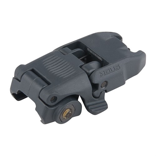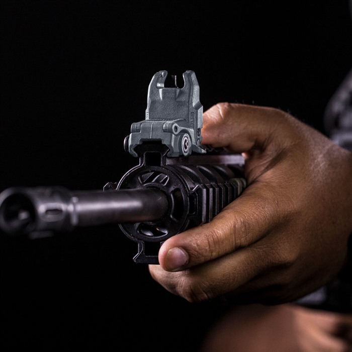 Low-profile, flattop-mounted, polymer sights deploy instantly at the touch of a finger to provide backup sighting if a primary optic fails. Streamlined contours mean there’s nothing to snag on brush, sling, or other gear when folded. Spring-loaded ambidextrous release mechanism lets you hit the grooved tab on either side of the sight to deploy, and lock it in place. Hitting the same tabs retract the sight when you're done. Uses less than 1" of MIL-STD 1913 Picatinny receiver rail space and locks securely in place with the included steel crossbolt. Provides the same height over bore as standard A2 iron sights. Front sight must be mounted on a railed forend on the same plane as the receiver rail to witness correctly with rear sight. Not compatible with railed gas blocks or the MOE handguard.