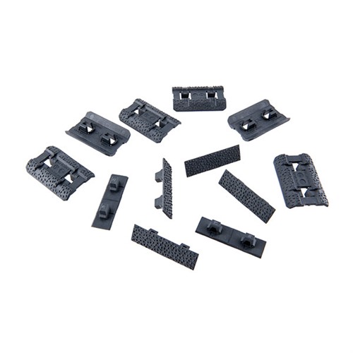 Kontaktflatene på disse dekkene er teksturert med Magpul TSP-tekstur for ekstra grep, og de tilfører litt mer enn 1/8” fra monteringsflaten. I tillegg har disse dekkene en avfaset kontur for å minimere potensielle hekter. Låsefanen er forhåndsskåret ned i midten for å la brukeren bryte av seksjoner og blande og matche farger for et mer tilpasset utseende. Inkluderer seks paneler, hver dekker en M-LOK-spor.