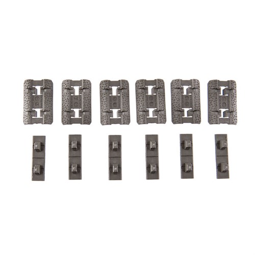M-LOK Type 2 Rail Covers are low-profile, two-piece covers that install directly onto M-LOK compatible systems. These M-LOK Covers are non-orientation specific which allow the user to mount them in any direction desired without affecting function. The contact surfaces on these covers are textured using the Magpul TSP texture for additional grip, adding slightly more than 1/8” from the mounting surface, these covers also feature a beveled contour to minimize potential snagging. The locking tab is pre-scored down the center to allow the user to snap off sections and mix and match colors for a more custom look. Includes six panels. Each covering one M-LOK slot.