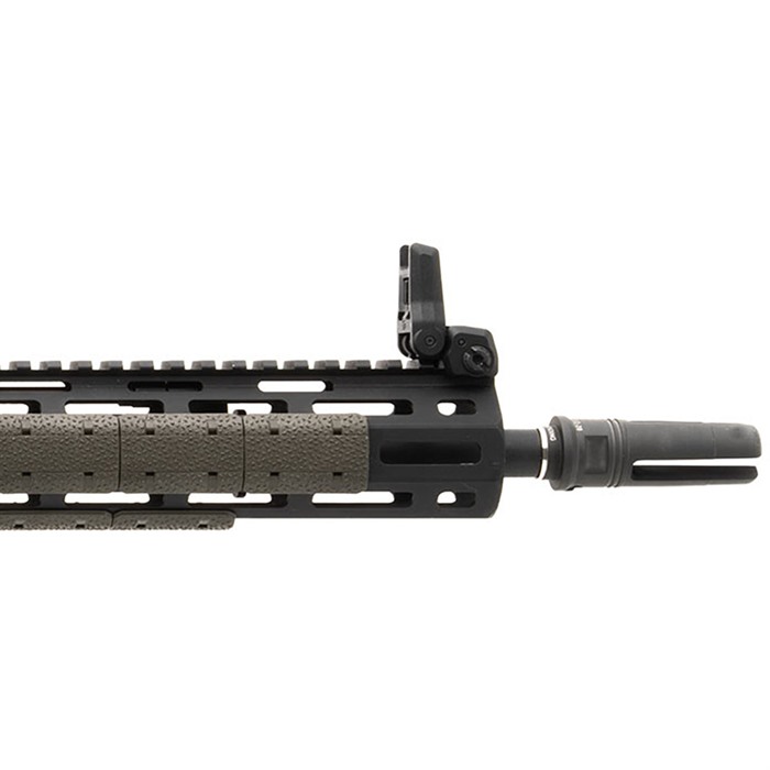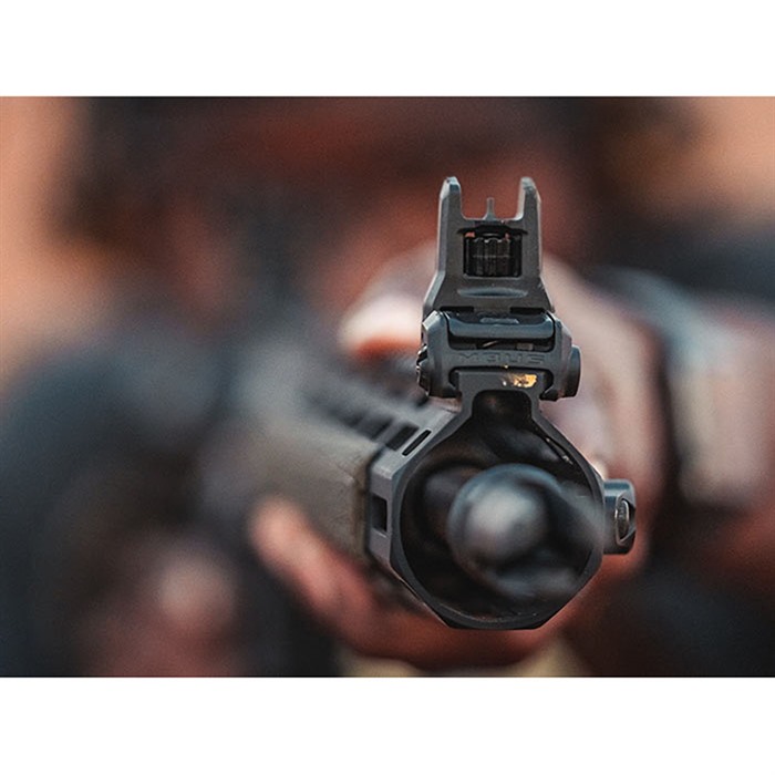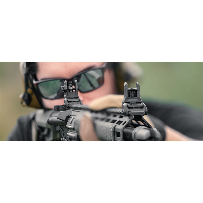 Et fjærbelastet trykknapp utløser Magpul MBUS 3 sammenleggbart front-sikte når det er nødvendig, og bringer det opp til standard AR-15 siktehøyde. Du trenger ingen verktøy for å justere høyden på dette siktet, og det er til og med inkludert et front-sikte med dobbel bredde som ligner på det som finnes på MBUS Pro.