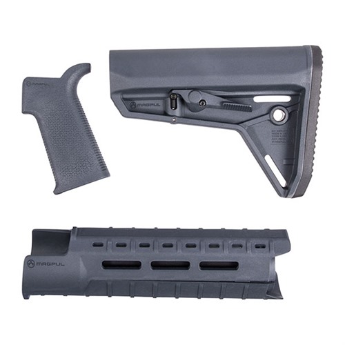 Upgrade your AR-15 rifle with this MOE-SL furniture set by Magpul. The MOE SL Stock – Mil-Spec Model is a drop-in replacement buttstock for AR-15/M4 carbines using mil-spec or commercial sized receiver extension tubes. Designed for the modern battlefield, the sleek profile, dual-side release latches, rolled toe, and angled rubber butt-pad is optimized for use with body armor or modular gear and provides for efficient shoulder transitions. The MOE SL Hand Guard for AR-15/M4 firearms with carbine-length gas system and A2 front sight provides modular flexibility with M-LOK accessory slots in a lightweight, sleek, cost effective design. Similar to the MOE-K2, the MOE SL Grip (Magpul Original Equipment Slim Line) is a drop-in upgrade for AR-15/M4 pistol grips with a more vertical grip angle optimized for short LOP weapons that bring the primary hand in closer to the shooter’s body. With an aggressive new texture for positive weapon control along with excellent ergonomics, the SL Grip provides a slightly smaller size and slimline feel. All mounting hardware included. Must be used with the triangular A2 front sight assembly; other gas blocks are not compatible.