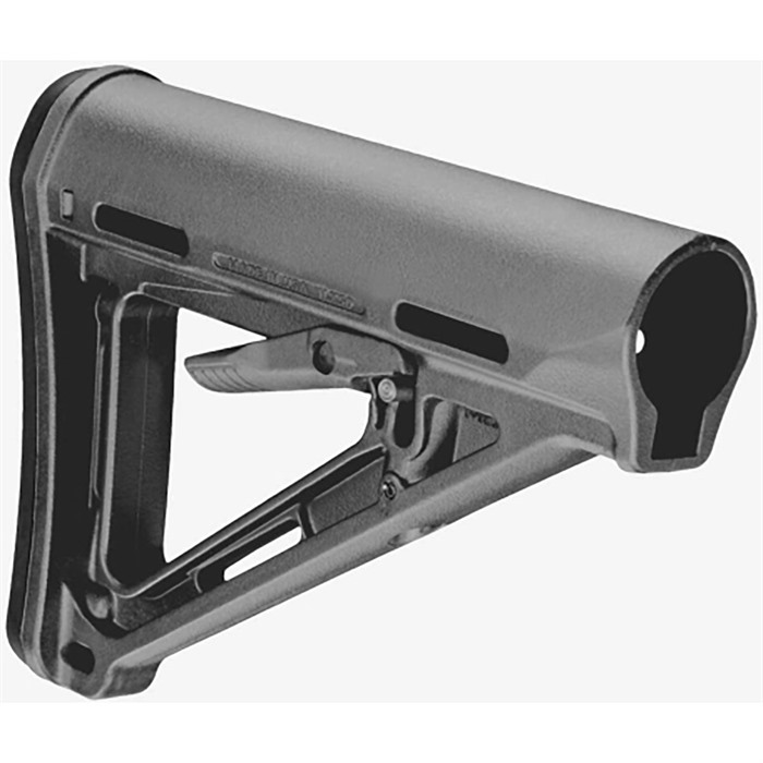 Magpul Original Equipment (MOE) carbine buttstock provides the quality, durability, and ergonomic benefits of Magpul’s CTR stock in a rugged, economical, drop-in package. Strong, A-frame design is lightweight and comfortable, yet provides operator with plenty of support. Comb contour is wider than standard issue M4 stock to help shooter maintain a solid, consistent cheekweld. Streamlined exterior and protected release lever won’t snag on clothing, gear, vehicle interior, or vegetation. Heavy duty, spring-loaded release lever allows fast length-of-pull adjustments and won’t dig into your hand. Impact- and heat-resistant, polymer construction includes molded-in reinforcements at stress points, plus two slots for web slings and a hole for a toe-mounted sling swivel or clip-on sling. Soft, synthetic rubber buttpad increases comfort and helps prevent slippage. Mil-Spec fits 1.14" O.D. buffer tubes on Colt-manufactured M4 and similar mil-spec tubes that accept both four- and six-position collapsible stocks.