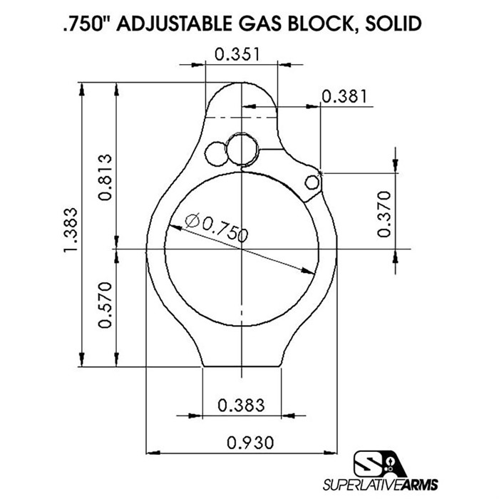 The Superlative Arms patented “Bleed Off”, direct impingement, gas block for the AR15 platform adjusts the gas flow by bleeding the gas out of the block instead of restricting the flow like conventional adjustable blocks. Results: The pressure used in the block is reduced only to the amount required to drive the bolt carrier. The remaining gas / pressure are bled out of the block allowing the system to run much cleaner and cooler. Reduction of felt recoil. Patented adjustment detent is located outside of the block and therefore no contamination. The gas adjustment screw does not restrict the gas flow; therefore there is no erosion or seizing of the screw / no loss of detent due to carbon build up. Although it is removable, we have added a safety mechanism, which stops you from unintentionally backing the screw all the way out. When using SBR’s and / or suppressors the bleed off port allows the excessive pressure to be exhausted out of the block reducing blow back. Data: Gas Block Material: 416 SS Barrel Diameter: 0.625" Weight: 1.37 oz. Length: 1.00" Attachment Type: Solid Gas Adjustment: 30 Locked Positions, Front Of Block Bleed Off Port: Front Of Block Included: Gas Block - Assembled (2) 10-32 x 3/16" Set Screws (1) Gas Tube Roll Pins (1) 3/32 X 6" L-Shaped Hex Keys Installation Instructions & QR code for video tutorial