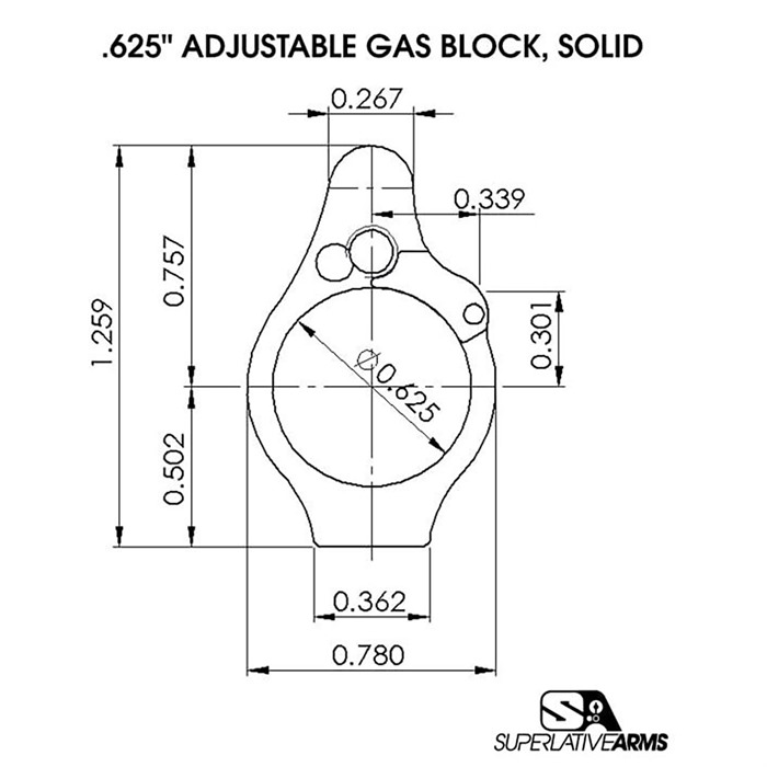 The Superlative Arms patented “Bleed Off”, direct impingement, gas block for the AR15 platform adjusts the gas flow by bleeding the gas out of the block instead of restricting the flow like conventional adjustable blocks. Results: The pressure used in the block is reduced only to the amount required to drive the bolt carrier. The remaining gas / pressure are bled out of the block allowing the system to run much cleaner and cooler. Reduction of felt recoil. Patented adjustment detent is located outside of the block and therefore no contamination. The gas adjustment screw does not restrict the gas flow; therefore there is no erosion or seizing of the screw / no loss of detent due to carbon build up. Although it is removable, we have added a safety mechanism, which stops you from unintentionally backing the screw all the way out. When using SBR’s and / or suppressors the bleed off port allows the excessive pressure to be exhausted out of the block reducing blow back. Data: Gas Block Material: 416 SS Barrel Diameter: 0.625" Weight: 1.37 oz. Length: 1.00" Attachment Type: Solid Gas Adjustment: 30 Locked Positions, Front Of Block Bleed Off Port: Front Of Block Included: Gas Block - Assembled (2) 10-32 x 3/16" Set Screws (1) Gas Tube Roll Pins (1) 3/32 X 6" L-Shaped Hex Keys Installation Instructions & QR code for video tutorial