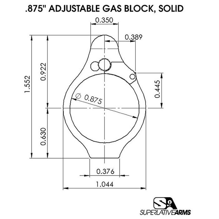 The Superlative Arms patented “Bleed Off”, direct impingement, gas block for the AR15 platform adjusts the gas flow by bleeding the gas out of the block instead of restricting the flow like conventional adjustable blocks. Results: The pressure used in the block is reduced only to the amount required to drive the bolt carrier. The remaining gas / pressure are bled out of the block allowing the system to run much cleaner and cooler. Reduction of felt recoil. Patented adjustment detent is located outside of the block and therefore no contamination. The gas adjustment screw does not restrict the gas flow; therefore there is no erosion or seizing of the screw / no loss of detent due to carbon build up. Although it is removable, we have added a safety mechanism, which stops you from unintentionally backing the screw all the way out. When using SBR’s and / or suppressors the bleed off port allows the excessive pressure to be exhausted out of the block reducing blow back. Data: Gas Block Material: 416 SS Barrel Diameter: 0.625" Weight: 1.37 oz. Length: 1.00" Attachment Type: Solid Gas Adjustment: 30 Locked Positions, Front Of Block Bleed Off Port: Front Of Block Included: Gas Block - Assembled (2) 10-32 x 3/16" Set Screws (1) Gas Tube Roll Pins (1) 3/32 X 6" L-Shaped Hex Keys Installation Instructions & QR code for video tutorial