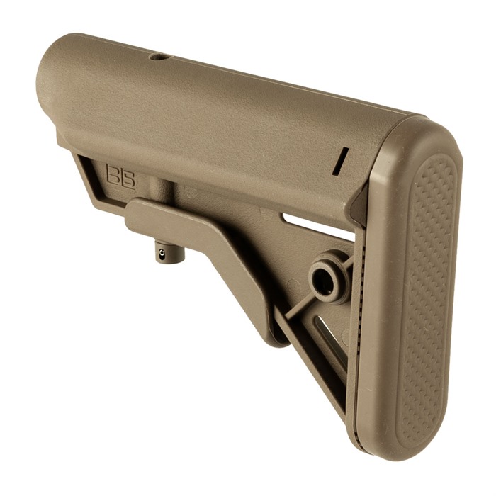 B5 SYSTEMS BRAVO COLLAPSIBLE MIL-SPEC STOCK FOR AR-15 Building upon the success of the B5 Systems Enhanced SOPMOD, B5 has taken the features end users demand; offering them in a lighter, more compact, and stronger buttstock. The Bravo stock maintains the SOPMOD cheek weld, one piece anti-rotation quick disconnect sling mount, non-slip cushioned buttpad, and improved sure grip stock latch. The Bravo omits the storage capability of the SOPMOD to provide a slimmer profile and angles the rear of the stock ensuring quick and consistent stock placement against the shoulder and cheek. Made of Mil-Spec materials and finishes. Currently employed by the U.S. military, this reinforced polymer stock fits M4-type receiver extensions and offers an improved cheekweld designed for increased comfort and consistency. Streamlined contours resist snagging on clothing, equipment, or vegetation to aid in safe and stealthy operation. Sure-Grip stock latch ensures convenient and intuitive length-of-pull adjustment, while the anti-slip rubber recoil pad secures the weapon to the operator’s shoulder. Features a black, stainless steel QD swivel mount and two molded 1¼" wide sling slots. FEATURES Ergonomic Cheek Weld Color-Matched Steel Hardware Fixed Sling Mounts and Steel Anti-Rotational QD Mounts Cushioned Non-slip Buttpad with Built in M4 Multi-Tasker® Tool Holder (tool sold separately) Sure Grip Stock Latch Made of MIL-SPEC Materials and Finishes Fits MIL-SPEC Carbine Receiver Extensions SPECS Weight: 9.3 oz Length: 7.2 in Width: 2 in Height: 4.9 Black and Tan models are TACOM approved and on the Additional Authorization List (AAL) for the M4/M4A1. Black NSN: 1005-01-706-2373 Flat Dark Earth NSN: 1005-01-706-2510