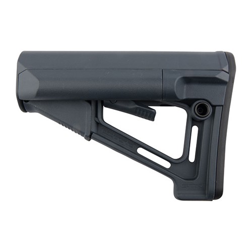 En forbedret versjon av Magpul CTR® stokken, STR (“Storage/Type Restricted”) bakstokken har to 4¼" batterilagringsrør plassert på venstre og høyre side, samt en bredere kinnvinkel for ekstra komfort. Gummipropper bak holder lagringsrommene motstandsdyktige mot vanninntrengning, men kan enkelt tas av for tilgang til to AA eller to CR-123 batterier inni.