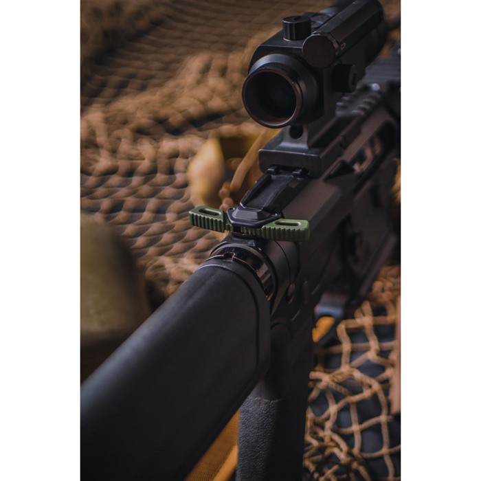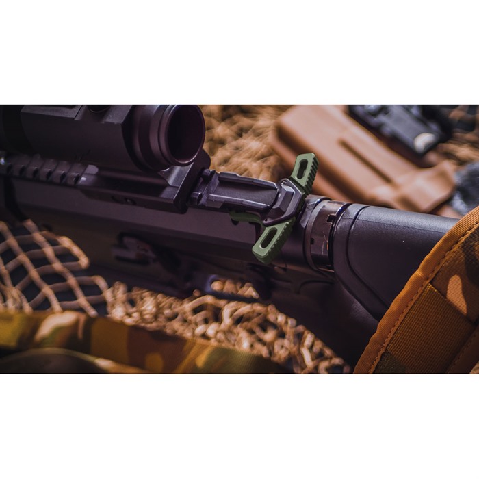 De mindre latchene på MICRO er laget for bruk når du skyter med utstyr, bånd eller barrierer for å unngå å hekte seg fast. Den totale bredden på latchene måler 2,40", noe som er litt bredere enn en standard charging handle. Det lave profil-designet holder den slank og stilren uten å ofre funksjonalitet. Laget helt av 7075 aluminium for ekstra styrke og holdbarhet!