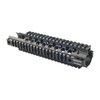 Two-piece, four-rail handguard installs easily and gives flattop receivers a continuous 12 o’clock rail. Clamps directly to standard barrel nut and features T-marks for proper optic and accessory remounting reference. Machined aluminum construction combines strength with light weight. Carbine Cutout model extends rails ¾" around sides of front sight base on carbine-length gas systems.