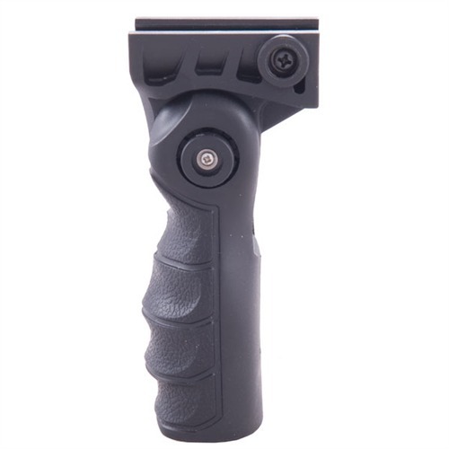 Fold-away vertical grip clamps to any forend with a bottom accessory rail and provides a comfortable platform for the support hand to improve control. Makes weapon easier to point to help you get on target—or change targets—fast. Pronounced finger grooves, textured surface, and a hand-filling shape help you maintain steady downward force to counteract muzzle rise during rapid fire. Hit the pushbutton on the left side of the grip to change between five locking positions: vertical, 45° forward/rearward, or folded forward/backward parallel with the handguard for storage or carry. Constructed of lightweight, yet robust, fiberglass-reinforced molded nylon to stand up to hard use; slides over Picatinny forend rail and locks in place with a steel crossbolt for solid, wobble-free installation.