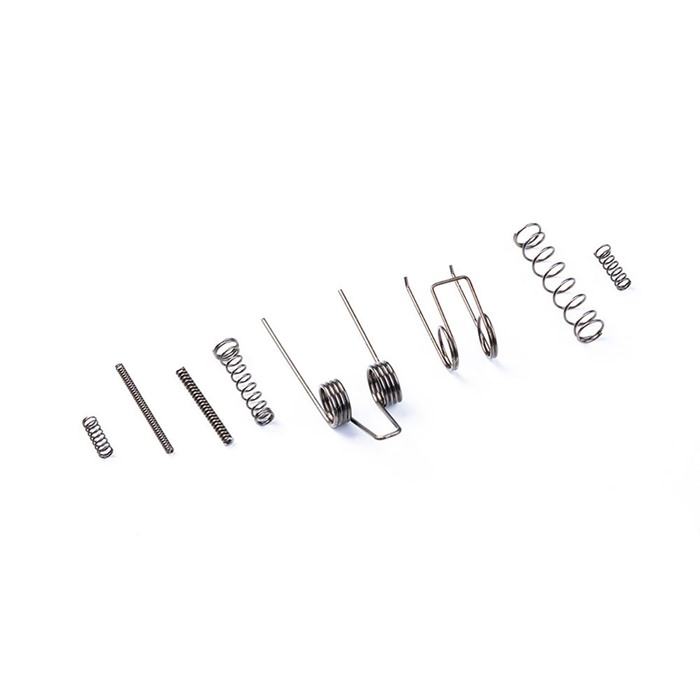 Verktøykassen inneholder 20 av hver type fjær som brukes i AR-15 lower receiver: bolt catch spring, buffer retainer spring, trigger spring, hammer spring, disconnector spring, magazine catch spring, selector spring og detent spring. Ideell for avdelingsvåpenmestere, detaljhandelsvåpenbutikker, eller hvem som helst som arbeider med, bygger eller reparerer store mengder AR-15.