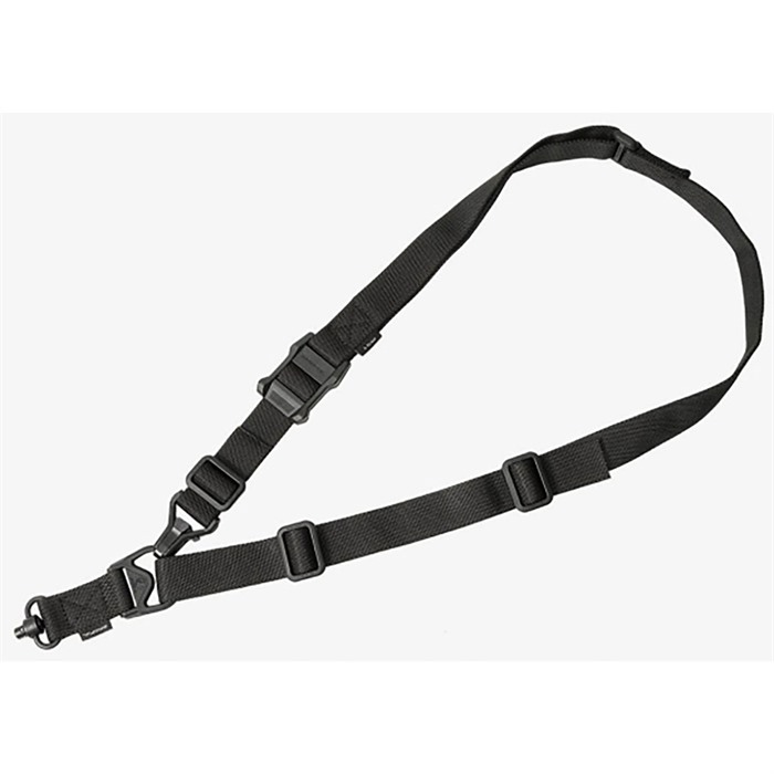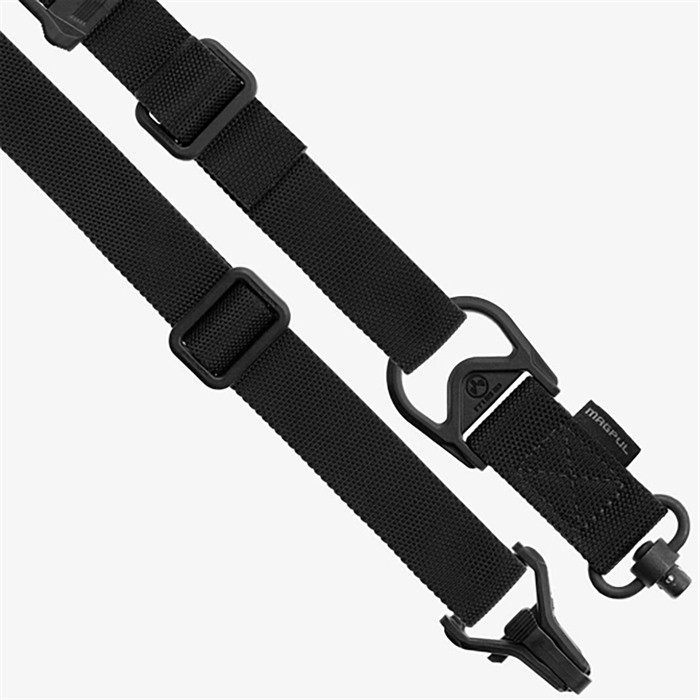 Filling the same mission requirement as the standard MS3 Sling, the MS3 Single QD can quickly switch between one-point and two-point configuration. The MS3 Single QD maintains material construction and specifications identical to that of the standard MS3, but features a heavy-duty push-button QD Sling Swivel for the one-point (rear) weapon attachment rather than the Magpul Paraclip™. This modification allows compatibility with QD sling cups commonly found on lower receivers, receiver end plates, and buttstocks. The MS3 Single QD GEN2 incorporates a new low profile quick-adjust Slider which minimizes bulk and allows for secure, yet effortless, sling adjustment. Webbing length has also been increased for a comfortable fit with all body types and armor configurations. Made in USA and 100% Berry Amendment compliant. NSN: MAG515-COY 1005-01-657-7616 FEATURES THE MS1® SLIDER Rapidly adjustable for length (shorter or longer) with new MS1 Slider Low-profile adjustment Slider for adding or removing sling tension in two-point mode with a single-hand MULTIPLE CONFIGURATIONS Designed for easy rapid convertability between one-point and two-point mode Heavy-duty push-button Quick Disconnect sling swivel for one-point attachment Paraclip shackle allows for fast transition between one-point and two-point configuration Cross-Bolt Lock Bar in the Paraclip allows the user to optionally lock its lever closed for extra security MAGPUL POLYMER AND INDESTRUCTIBLE HARDWARE Lightweight heavy-duty reinforced polymer hardware Steel Paraclip lever is case hardened and finished with a QPQ salt bath nitride process for extreme resistance to wear and corrosion SNAG-FREE, HIGH DURABILITY WEBBING Custom 1.25 inch wide nylon webbing material is strong and wear resistant while remaining anti-chaff for user comfort No tails, loops, or other potential snag hazards Colored webbing has Near Infrared (NIR) treatment to reduce IR signature SPECS Length, Overall Nominal: 48-60 in. ± 5 in. adjustment Slider Adjustment Range: 10 in. Width, Webbing: 1.25" SLING MOUNTING REAR - Works with the Magpul ASAP® for optimal shoulder transitioning in one-point mode as well as with other end plates, receivers, and buttstocks that have a QD sling socket FRONT - Compatible with the Magpul RSA®, M-LOK® Paraclip™ Sling Mount, MSA®, and shotgun Forward Sling Mounts, as well as many snap-hook style sling loops* and standard or QD sling swivels for use in two-point mode * Snap-hook style sling loops with an inner diameter of at least 3/8" are required, but 9/16" and larger will provide full range of motion of the Paraclip