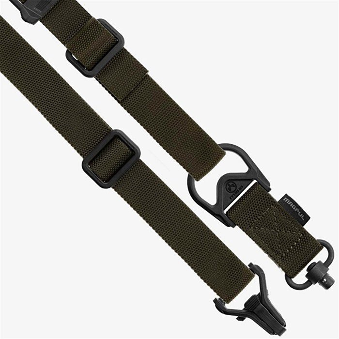 Filling the same mission requirement as the standard MS3 Sling, the MS3 Single QD can quickly switch between one-point and two-point configuration. The MS3 Single QD maintains material construction and specifications identical to that of the standard MS3, but features a heavy-duty push-button QD Sling Swivel for the one-point (rear) weapon attachment rather than the Magpul Paraclip™. This modification allows compatibility with QD sling cups commonly found on lower receivers, receiver end plates, and buttstocks. The MS3 Single QD GEN2 incorporates a new low profile quick-adjust Slider which minimizes bulk and allows for secure, yet effortless, sling adjustment. Webbing length has also been increased for a comfortable fit with all body types and armor configurations. Made in USA and 100% Berry Amendment compliant. NSN: MAG515-COY 1005-01-657-7616 FEATURES THE MS1® SLIDER Rapidly adjustable for length (shorter or longer) with new MS1 Slider Low-profile adjustment Slider for adding or removing sling tension in two-point mode with a single-hand MULTIPLE CONFIGURATIONS Designed for easy rapid convertability between one-point and two-point mode Heavy-duty push-button Quick Disconnect sling swivel for one-point attachment Paraclip shackle allows for fast transition between one-point and two-point configuration Cross-Bolt Lock Bar in the Paraclip allows the user to optionally lock its lever closed for extra security MAGPUL POLYMER AND INDESTRUCTIBLE HARDWARE Lightweight heavy-duty reinforced polymer hardware Steel Paraclip lever is case hardened and finished with a QPQ salt bath nitride process for extreme resistance to wear and corrosion SNAG-FREE, HIGH DURABILITY WEBBING Custom 1.25 inch wide nylon webbing material is strong and wear resistant while remaining anti-chaff for user comfort No tails, loops, or other potential snag hazards Colored webbing has Near Infrared (NIR) treatment to reduce IR signature SPECS Length, Overall Nominal: 48-60 in. ± 5 in. adjustment Slider Adjustment Range: 10 in. Width, Webbing: 1.25" SLING MOUNTING REAR - Works with the Magpul ASAP® for optimal shoulder transitioning in one-point mode as well as with other end plates, receivers, and buttstocks that have a QD sling socket FRONT - Compatible with the Magpul RSA®, M-LOK® Paraclip™ Sling Mount, MSA®, and shotgun Forward Sling Mounts, as well as many snap-hook style sling loops* and standard or QD sling swivels for use in two-point mode * Snap-hook style sling loops with an inner diameter of at least 3/8" are required, but 9/16" and larger will provide full range of motion of the Paraclip