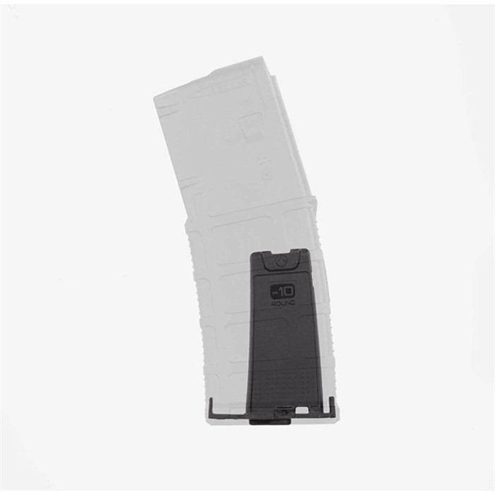 Dette hardpolymerinnlegget klikker enkelt på bunnplaten for å redusere kapasiteten. Det installeres lett uten verktøy og krever ingen permanent endring av magasinet. Vær oppmerksom på at dette ikke gjør et forbudt magasin lovlig, da kapasitetreduksjonen ikke er permanent. Minus 10 reduserer kapasiteten med 10 skudd.