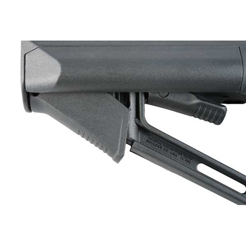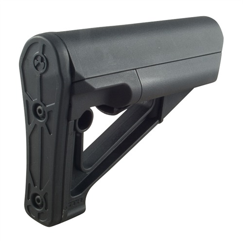 SPECS: Reinforced nylon polymer, Black, Dark Earth, or O.D. Green. 7¼" (18.4cm) OAL, 5¼" (13.3cm) high. LOP adjustment range: 3¼" (8.3cm). 12.5 oz (354g) wt. Mil-Spec – Fits mil-spec 1.14" O.D. carbine buffer tubes.