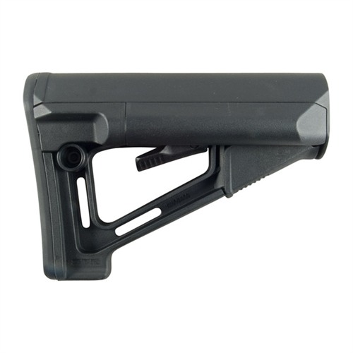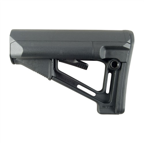 En forbedret versjon av Magpul CTR® lageret, STR (“Storage/Type Restricted”) bakstokken har to 4¼" batterilagringstuber plassert på venstre og høyre side, samt en bredere kinnstøtte for ekstra komfort. Gummikapper bak holder lagringsrommene motstandsdyktige mot vanninntrengning, men kan enkelt tas av for tilgang til to AA- eller to CR-123-batterier inni. Den har to integrerte 1¼" slynge-løkker.