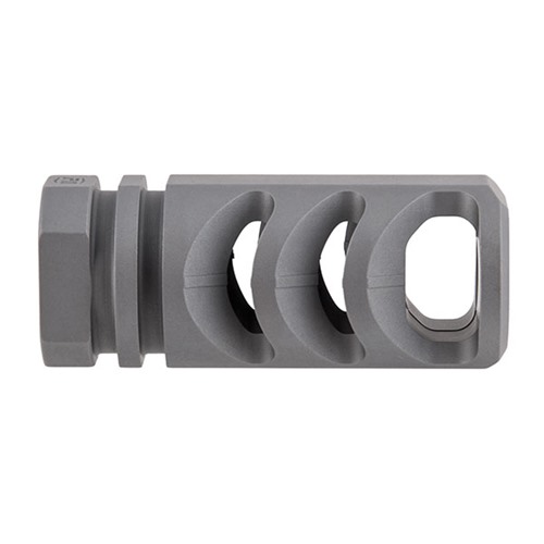 Compensator features a large initial expansion chamber which dissipates combustion gases at a lower pressure, then directs the gases to the side and rear through precisely canted vents. Innovative reverse venting design reduces recoil and blowback while eliminating muzzle rise. Closed bottom in compensator greatly diminishes dust signature. Machined from high strength stainless steel for corrosion resistance, compensator will not erode due to the extreme heat of automatic fire. Requires use of Accu-Washers sold seperately for proper installation.