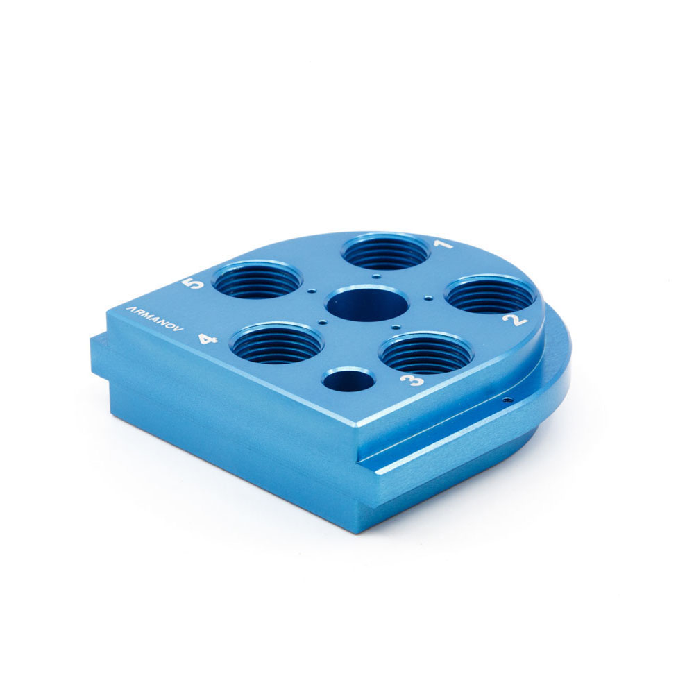 Denne toolheaden er laget etter de høyeste standardene. Den er CNC-bearbeidet fra 6082 aluminium, som er mye sterkere og har mindre fleksibilitet enn en støpt toolhead. Alle kritiske dimensjoner er bearbeidet i en enkelt operasjon, noe som sikrer at alle overflater er sanne og justert i forhold til hverandre. Die-hullene er plassert med en svært høy grad av nøyaktighet, og 7/8-14-gjengene er bearbeidet til strenge toleranser for presis passform og justering, noe som gir dies som er mer presist sentrert i hvert hull og bedre justert til patronene i skjoldplaten. Flensen er også flatere enn det som kan oppnås med en støpt toolhead.