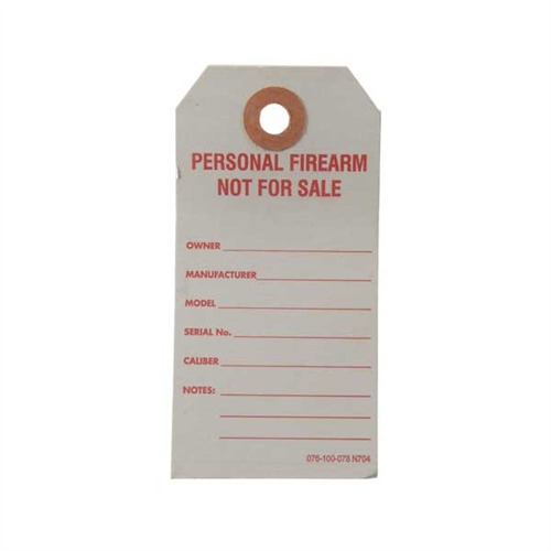 Disse grå papirbrett-tagene med røde bokstaver og forsterkede hull tydelig viser at et våpen i din butikk er et personlig våpen og ikke til salgs. De hjelper til med å holde butikken din i samsvar med BATF-reguleringene.