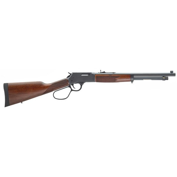 BIG BOY CLASSIC STEEL CARBINE 327 FEDERAL/32 H&R MAG LEVER ACTION RIFLE While Henry is fond of the brass tradition begun by B.T. Henry’s 1860 rifle, they do understand that today’s hunter may prefer something a shade lighter on the mountain, and the Big Boy Steel carries on the same brush gun appeal of the brass-framed Big Boys in its overall configuration, but with upgraded features for the modern hunter, while weighing in 1.68lbs. less than its cousin. The 7lbs. steel Big Boy hangs its 20″ round barrel and checkered walnut furniture on a matte-finished blued steel frame that’s drilled & tapped for optional scope mounts, and uses the same adjustable Western-style sights as the standard Big Boy, with the same sliding transfer bar safety system in its hammer. Most of the weight savings is due to the steel frame being lighter than a brass counterpart to begin with, and less steel in the thinner barrel walls than an octagon version. To make sure the steel Big Boy stays easy on the shoulder Henry uses a black solid rubber recoil pad. For hands-free hiking up or down, it wears sling swivel studs; and they’ve also added a rifle-style fore-end cap instead of the usual carbine-type barrel band. A perfect choice for straight-walled cartridge hunting laws in Ohio, Indiana, Southern Michigan, and other areas; with its subdued no-spook-em dark finish and easy-to-maneuver dimensions, they’ve got that brand new deer rifle you’ve been looking for right here. SPECIFICATIONS: Barrel Length: 16.5" Barrel Type: Round Blued Steel Rate of Twist: 1:16 Overall Length: 34" Weight: 6.59 lbs. Receiver Finish: Blued Steel Rear Sight: Fully Adj. Semi-Buckhorn w/ Diamond Insert Front Sight: Brass Bead Scopeability: Drilled and Tapped Scope Mount Type: BB-RSM Stock Material: American Walnut Buttplate/Pad: Black Solid Rubber Recoil Pad Length of Pull: 14" Safety: Transfer Bar Best Uses: Target/Hunting/Large Game Embellishments/Extras: Swivel Studs.