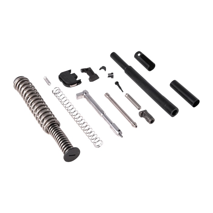New and improved kit now comes with a billet firing pin. Contains all the parts you need to complete the innards of an aftermarket slide or refurbish a factory slide to like-new standards. All the parts in our Glock®17® Gen 3 OR Gen 5 Slide Parts Kit are aftermarket parts made to the correct dimensions for proper fit, finish, and function in a factory spec slide. The extractor is made from cast 17-4 SS. The firing pin is made from billet to improve the strength. The extractor depressor plunger and firing pin safety are machined from bar stock. Includes channel liner tool to properly install the channel liner. Kit Includes: Extractor Extractor Depressor Plunger Extractor Depressor Plunger Spring Spring -Loaded Bearing Slide Cover Plate Billet Firing Pin Spacer Sleeve Firing Pin Spring Spring Cups Firing Pin Safety Firing Pin Safety Spring Channel Liner Channel Liner Tool Guide Rod and Recoil Spring Assembly