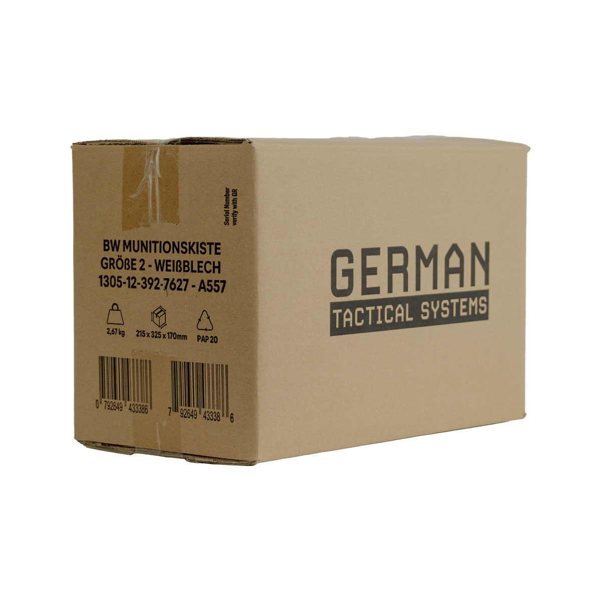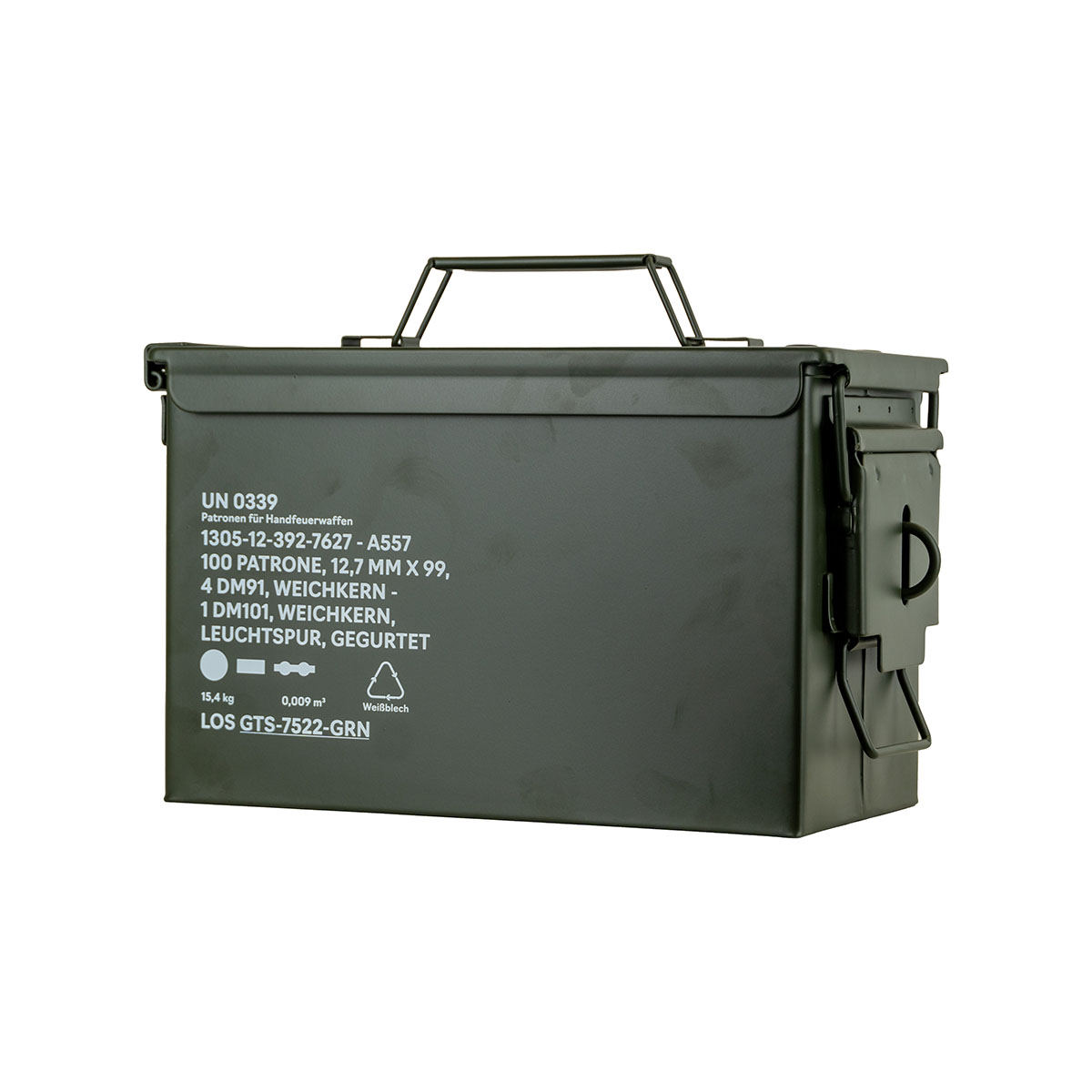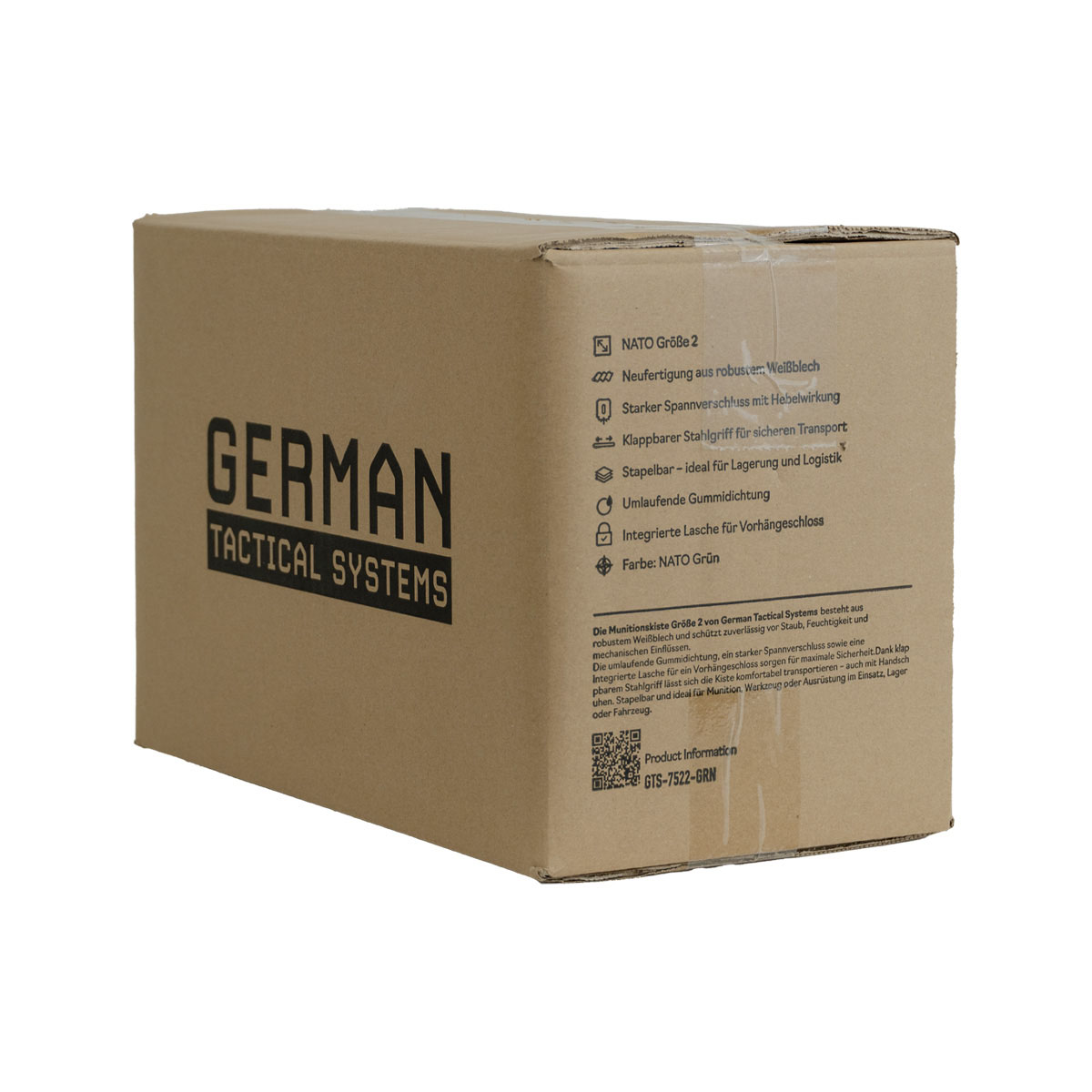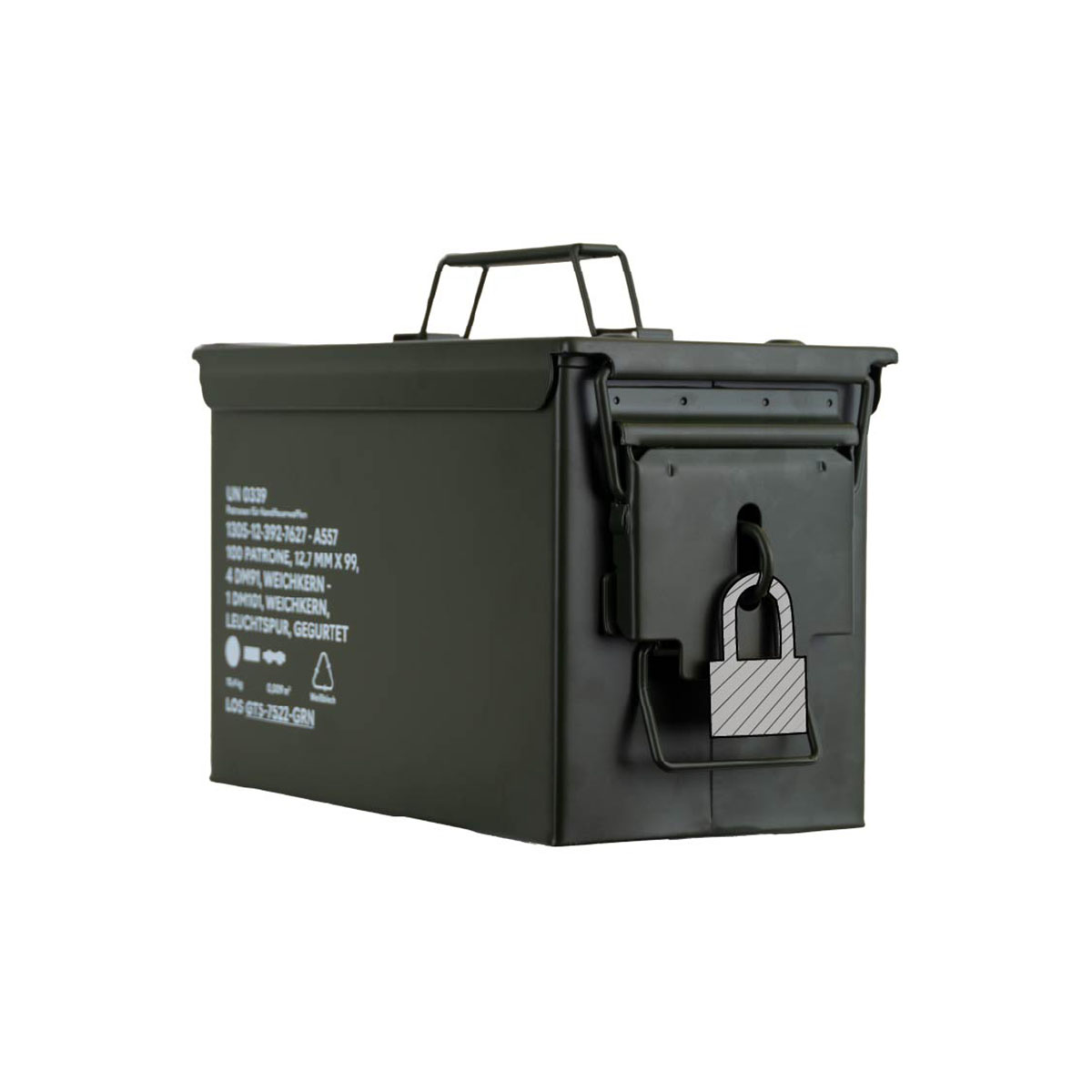 0792649433386 The German Tactical Systems BW Ammo Can (NATO Size 2 (12.7 mm / .50 Cal) is built from rugged tinplate steel, providing dependable protection against dust, moisture, and impacts. Designed for demanding use in the field, during transport, or in storage, it keeps your ammunition and gear secure in any environment. A continuous rubber gasket ensures a tight seal, while the heavy-duty lever-lock latch keeps the lid firmly closed. For extra security, the integrated padlock tab allows you to lock the contents. The foldable steel carry handle makes transport comfortable, even with gloves, and the stackable design is ideal for organized storage and logistics. Key Features: NATO Size 2 (12.7 mm / .50 Cal) – new production from robust tinplate steel Strong lever-lock latch for secure closure Continuous rubber gasket for dust and moisture protection Foldable steel handle for safe, comfortable carrying Integrated padlock tab for added security (lock not included) Stackable design – ideal for storage and transport Color: NATO Green Perfect for storing ammunition, tools, or mission-critical equipment, the GTS BW Ammo Can delivers military-grade reliability for professionals and enthusiasts alike. Pair it with the GTS Gear Dehumidifier to keep contents dry and corrosion-free for long-term storage.Leveringstid ca. 7-10 dager.
